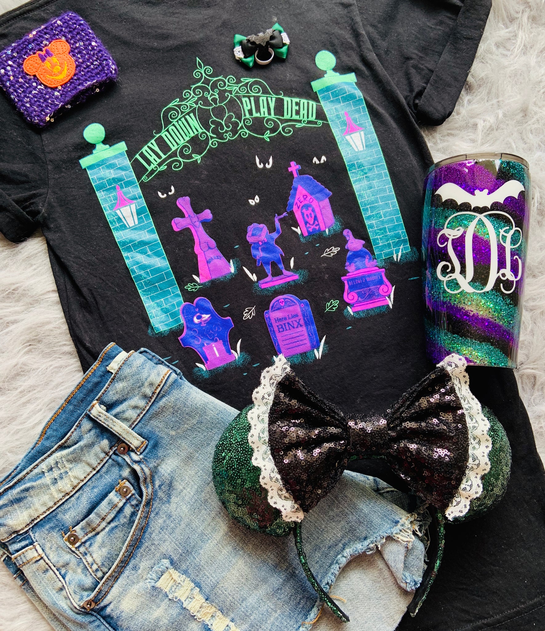 Ghostly Manor ears feature a dark green sequin fabric on the ears and headband. The bow is a black sequin fabric with a white lace trim. The inside of the headband is lined with a black ribbon.